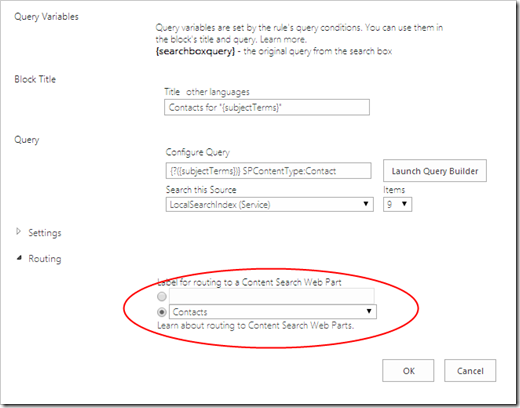 The nugget in this post is perhaps the next step. Click the Routing option, and choose to route the results to a name of your choice, in this case I picked Contacts. This will give you the option to target a result table with that specific name later on. (I’ll cover routing in more detail in episode 10 of my SharePoint Search Queries Explained series)